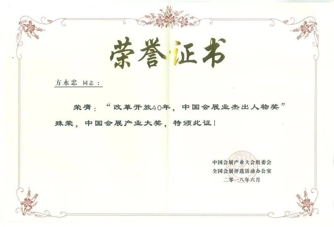 在“2018中国会展产业发展大会·改革开放40周年品牌盛典”上,武汉瑞美展览股份有限公司荣获“改革开放40周年中国会展企业大奖”,瑞美股份董事长方永忠先生荣获“改革开放40周年中国会展企业40人奖”。